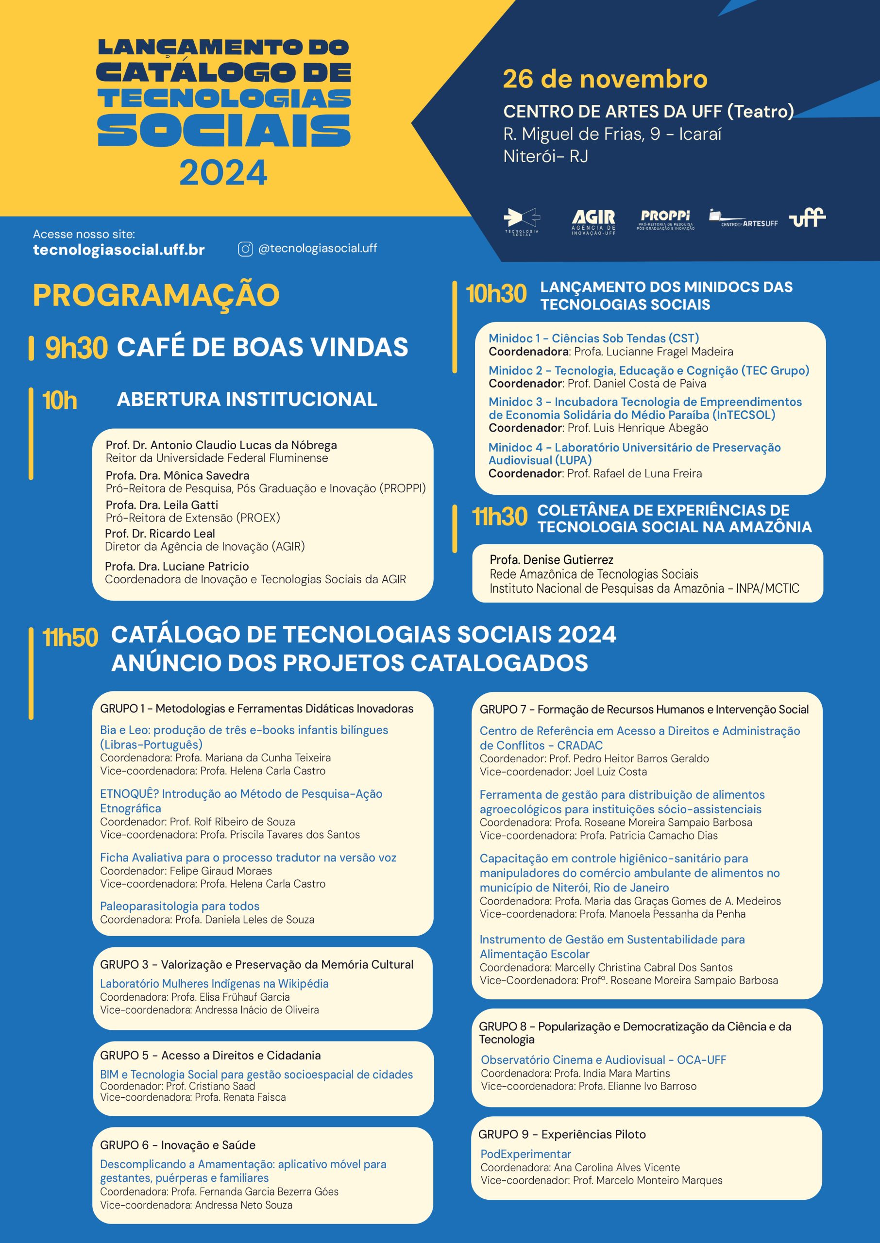 No próximo dia 26 de novembro, das 10h às 13h, a Universidade Federal Fluminense (UFF) realizará o lançamento do Catálogo de Tecnologias Sociais 2024 no Teatro da UFF, localizado na Rua Miguel de Frias, 9, em Icaraí, Niterói. O evento também contará com transmissão ao vivo realizada pelo LEMI – Laboratório Estúdio Multimídia do INCT INEAC, por meio do canal oficial do INEAC no YouTube.